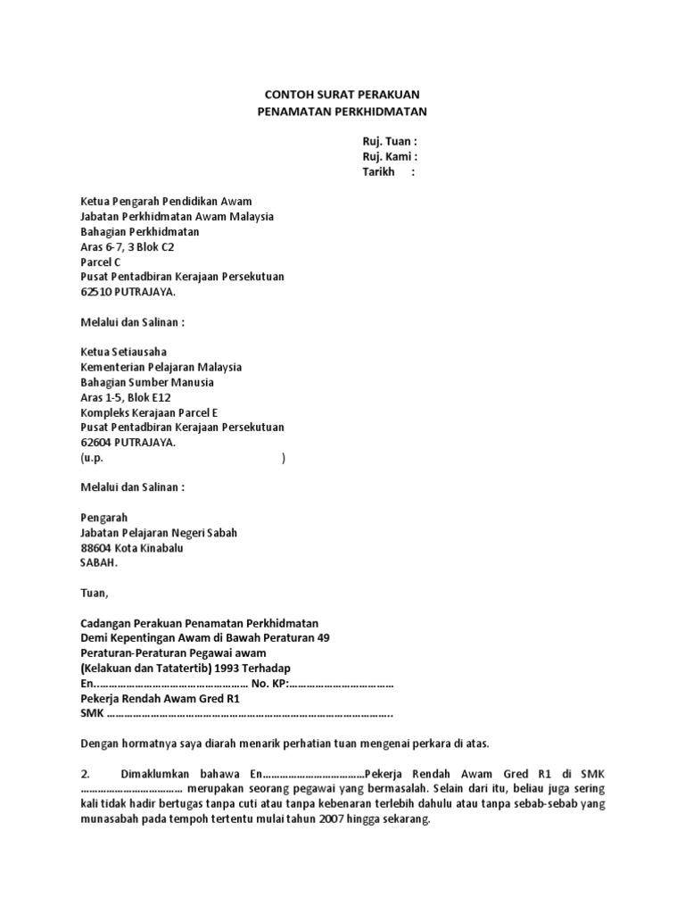 Perkhidmatan Awam 5 Surat Tamat Perkhidmatan Jika kakitangan bergaji hari didapati melakukan kesalahan yang sama surat kepada kakitangan berkenaan mengenai. Surat Pekeliling Perkhidmatan Bilangan 1 Tahun 2002 dan Pekeliling Perkhidmatan Bilangan 1 Tahun 2016 Kelayakan SVM Sebagai Syarat Lantikan Dalam Perkhidmatan Awam. Contoh Surat Tamat Kontrak Perkhidmatan - Akta Kerja 1955 Notis Berhenti Kerja Dulu Lain Sekarang Lain.